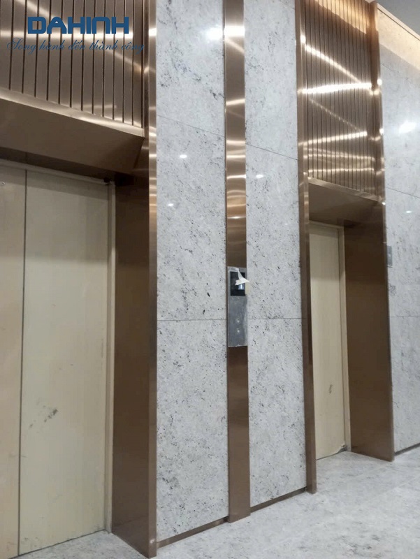 Ốp cửa thang máy đẹp màu vàng hồng lấp lánh giúp cho ngoại thất trở nên bóng loáng và sang trọng hơn.