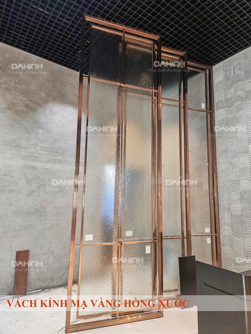 Vách kính mạ vàng hồng xước là hệ thống vách ngăn kết hợp giữa kính cường lực cao cấp và khung định hình bằng inox (thường là inox 304).